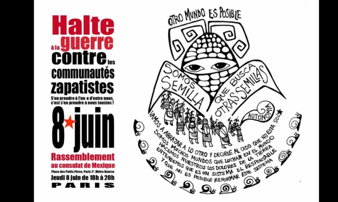 Halte a la guerre contre las communautes zapatistes 8 juin Rassemblement au consulat de Mexique Plase des petits peres, Paris 2 metro Bourse Jeudi 8 juin de 18h á 20h