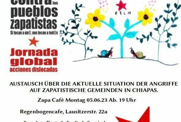 Zapa Café Montag 05.06. 15-22 Uhr geöffnet Diesmal: Es gibt leckere vegane Tacos und wie immer: Kaffe und Kuchen! Ab 19 Uhr: Informeller Austausch über aktuelle Situation der Angriffe auf zapatistische Gemeinden…