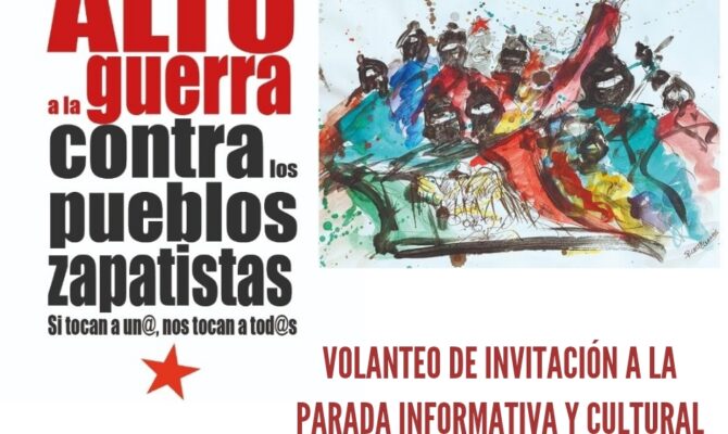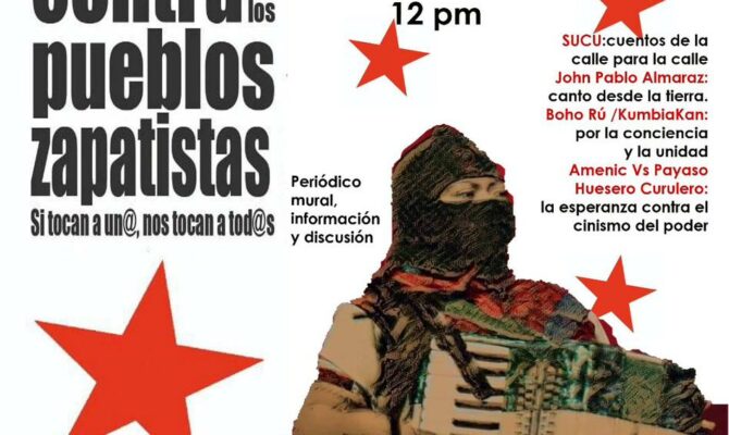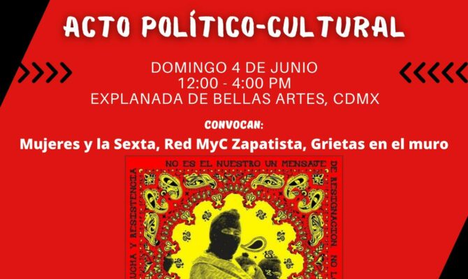 ALTO A LA GUERRA CONTRA LAS COMUNIDADES ZAPATISTAS Acto político cultural Domingo 4 de junio 12:00-4:00 pm Explanada de Bellas Artes, CDMX Convocan: Mujeres y la Sexta, Red MyC Zapatista, Grietas en…