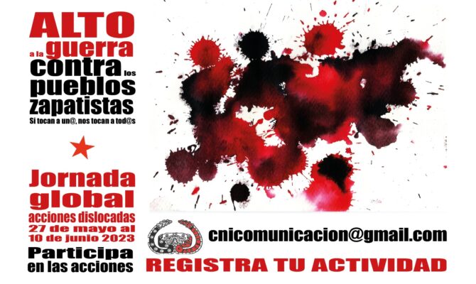 ALTO A LA GUERRA CONTRA LOS PUEBLOS ZAPATISTAS Si tocan a un@ nos tocan a tod@s Jornada global Acciones dislocadas 27 de mayo al 10 de junio 2023 Participa en las acciones…