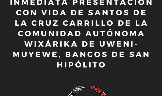 CONGRESO NACIONAL INDÍGENA EXIGE LA INMEDIATA PRESENTACIÓN CON VIDA DE SANTOS DE LA CRUZ CARRILLO DE LA COMUNIDAD AUTÓNOMA WIXÁRIKA DE UWENI-MUYEWE, BANCOS DE SAN HIPÓLITO