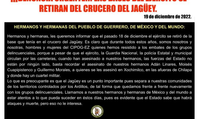 19 de diciembre de 2022. HERMANOS Y HERMANAS DEL PUEBLO DE GUERRERO, DE MÉXICO Y DEL MUNDO: Hermanos y hermanas, les queremos informar que el pasado 18 de diciembre el ejército…