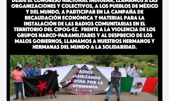 Desde el Congreso Nacional Indígena, llamamos a las organizaciones y colectivos, a los pueblos de México y el mundo, a participar en la campaña de recaudación económica y material para la instalación…