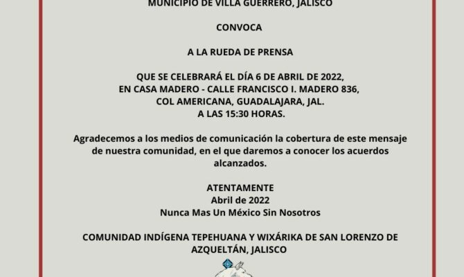 INVITACIÓN A RUEDA DE PRENSA QUE OFRECERÁ LA COMUNIDAD INDÍGENA DE SAN LORENZO DE AZQUELTÁN, MUNICIPIO DE VILLA GUERRERO, JALISCO, ANTE LA NUEVA INVASIÓN TERRITORIAL POR ESTUDIOS DE PROSPECCIÓN MINERA EN…