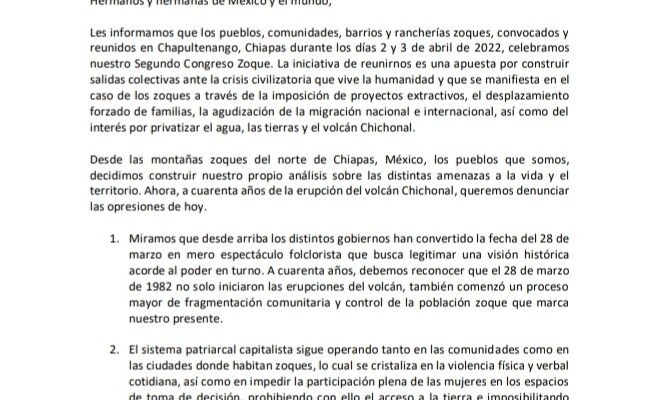 A 40 años de las erupciones del volcán Chichonal. Pronunciamiento de los pueblos Zoques de Chiapas, México