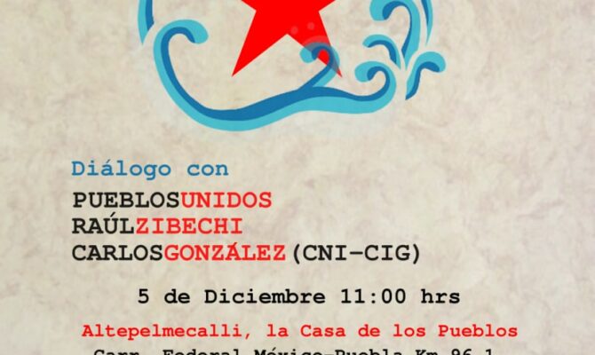Diálogo con: Pueblos Unidos Raúl Zibechi Carlos González (CNI-CIG) 5 de Diciembre 11:00 hrs Altepelmecalli, la Casa de los Pueblos Carr. Federal Mexico-Puebla Km 96.1 San Mateo Cuanala, Juan C. Bonilla, Puebla.…