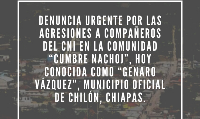 Denuncia urgente por las agresiones a compañeros del CNI en la comunidad “Cumbre Nachoj”, hoy conocida como “Genaro Vázquez”, municipio oficial de Chilón, Chiapas.