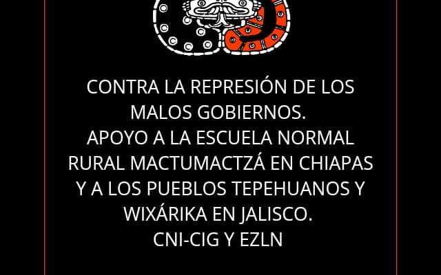 CONTRA LA REPRESIÓN DE LOS MALOS GOBIERNOS. APOYO A LA ESCUELA NORMAL RURAL MACTUMACTZÁ EN CHIAPAS Y A LOS PUEBLOS TEPEHUANO Y WIXÁRIKA EN JALISCO. CNI-CIG Y EZLN.