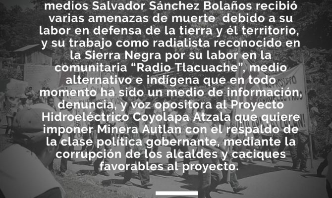 Denuncia por amenazas a Salvador Sánchez Bolaños opositor al proyecto hidroeléctrico Coyolapa Atzala,Puebla