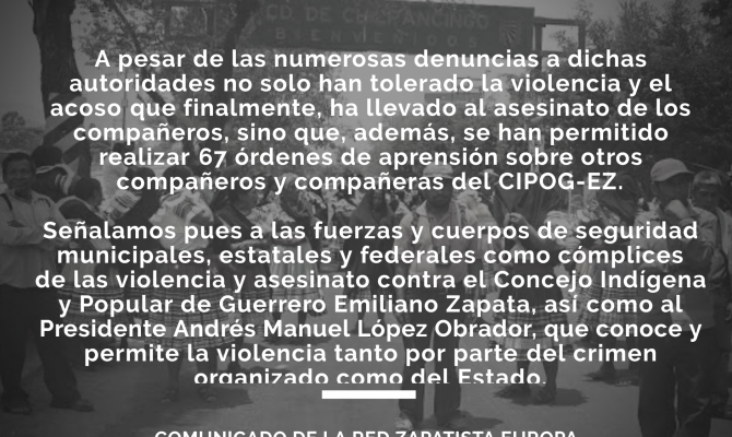 El Congreso Nacional Indígena, el Concejo Indígena de Gobierno y el Ejército Zapatista de Liberación Nacional, con dolor e indignación, condenamos el secuestro y asesinato del compañero concejal nahua del Concejo Indígena…