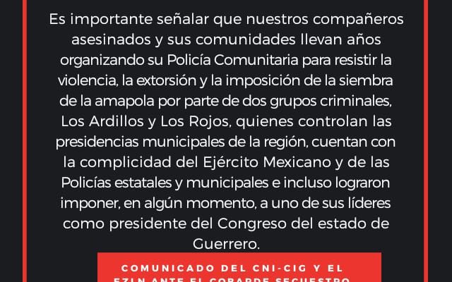 COMUNICADO DEL CNI-CIG Y EL EZLN ANTE EL COBARDE SECUESTRO Y ASESINATO DE LOS COMPAÑEROS DEL CONCEJO INDÍGENA Y POPULAR DE GUERRERO- EMILIANO ZAPATA.