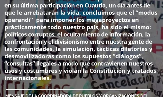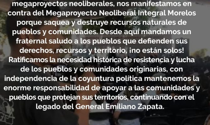 ¡Manifiesto Zapata vive, la lucha sigue! ¡No al megaproyecto neoliberal integral Morelos!