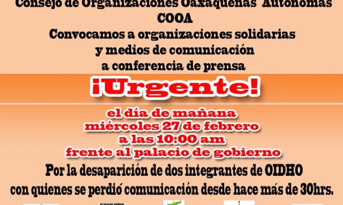 URGENTE: Organizaciones Indias por los Derechos Humanos en Oaxaca – OIDHO – denunciamos la desaparición de nuestros compañeros Eutiquio Ríos Cruz y Roberto Carlos Pérez Cortés, integrantes de nuestro consejo directivo saliente…