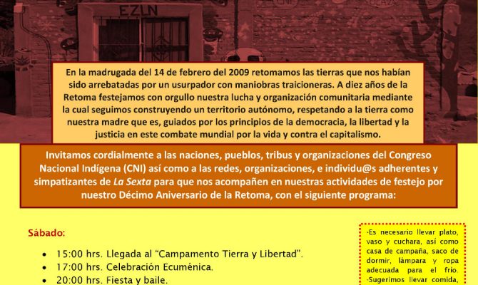 2019, Año de nuestro General en Jefe Emiliano Zapata Festejo por el Décimo Aniversario de la Retoma Sábado 23 y domingo 24 de febrero de 2019 “Campamento Tierra y Libertad” de la…