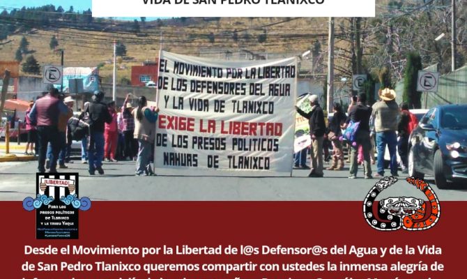 Comunicado del Movimiento por la Libertad de los Defensores del Agua y la Vida de San Pedro Tlanixco por los tres compañeros Ya libres y con nosotros