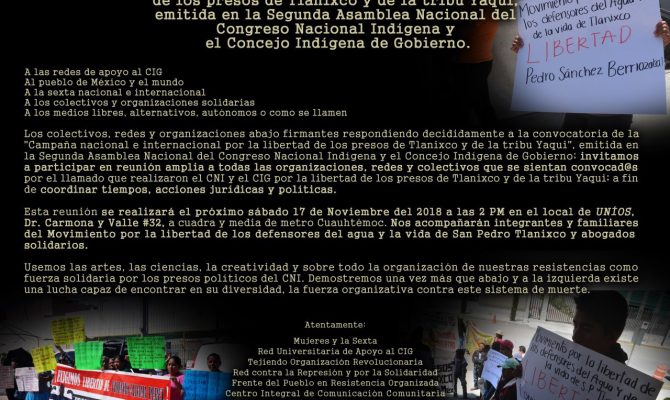 Convocatoria para Sumarse y Fortalecer la Campaña Nacional e Internacional por la Libertad de los Presos de Tlanixco y la Tribu Yaqui