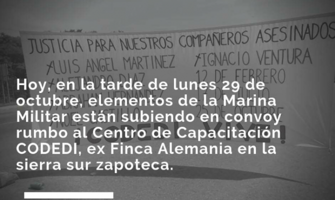 URGENTE: EJÉRCITO HOSTIGA CODEDI Hoy, en la tarde de lunes 29 de octubre, elementos de la Marina Militar están subiendo en convoy rumbo al Centro de Capacitación CODEDI, ex Finca Alemania en…