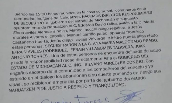 NAHUAZTEN MICHOACÁN A 08 DE NOVIEMBRE DEL 2018 Siendo las 12:00 horas reunidos en la casa comunal, comuneros de la comunidad indígena Nahuatzen, HACEMOS DIRECTOS RESPONSABLES DE SECUESTRO al gobierno del estado…