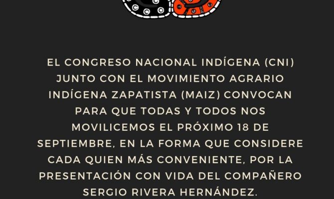 Convocatoria del CNI y MAIZ a movilización por la presentación con vida del compañero Sergio Rivera Hernández