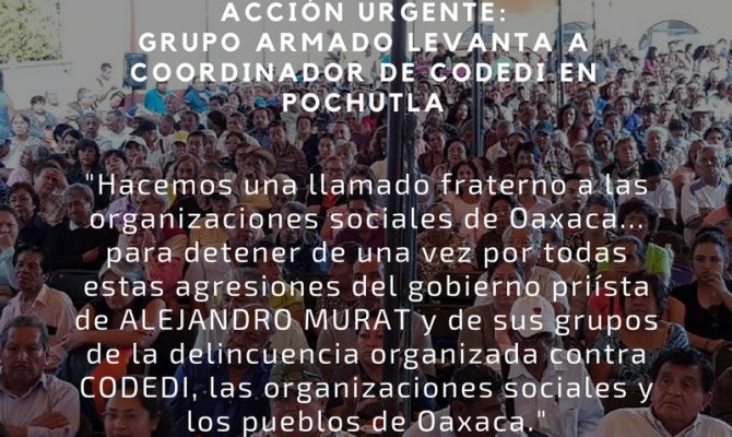 ACCIÓN URGENTE: Grupo armado levanta a coordinador de CODEDI en Pochutla Hoy martes 17 de Julio a las 11:30 am, un grupo de hombres armados y encapuchados levantaron en su propio domicilio…