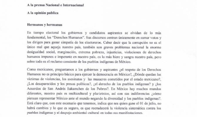 Organización de la Sociedad Civil “Las Abejas” Tierra Sagrada de los mártires. Acteal, Chenalhó. Chiapas. México. 27 de Junio del 2018 Al pueblo de México y del mundo A la prensa…
