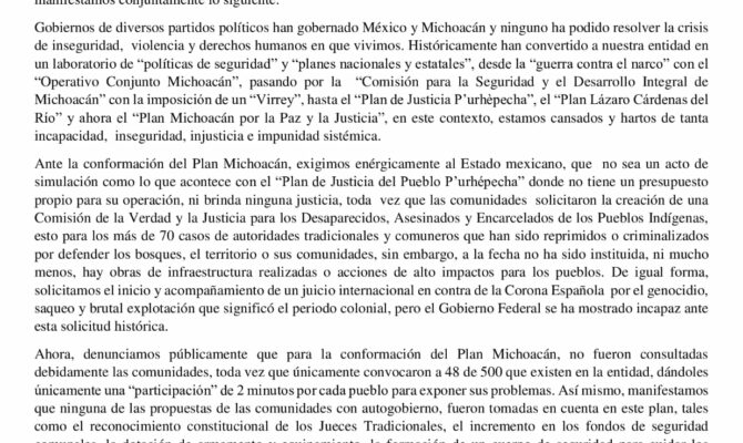 PLAN MICHOACÁN: DISCRIMINATORIO, UNILATERAL Y ENGAÑOSO AL GOBIERNO DE LA REPÚBLICA MEXICANA AL GOBIERNO DE MICHOACÁN A LAS COMUNIDADES ORIGINARIAS AL PUEBLO DE MÉXICO Y DE MICHOACÁN A LOS MEDIOS DE COMUNICACIÓN…