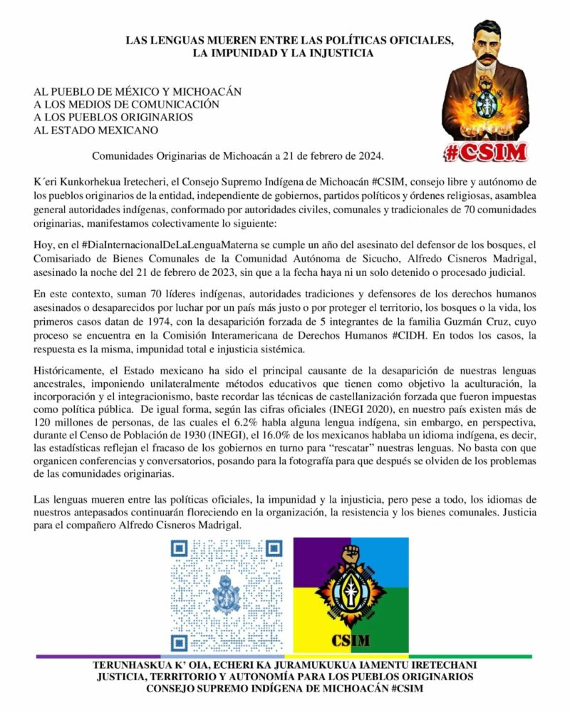 Las lenguas mueren entre las políticas oficiales, la impunidad y la injusticia: Consejo Supremo Indígena de Michoacán (CSIM)