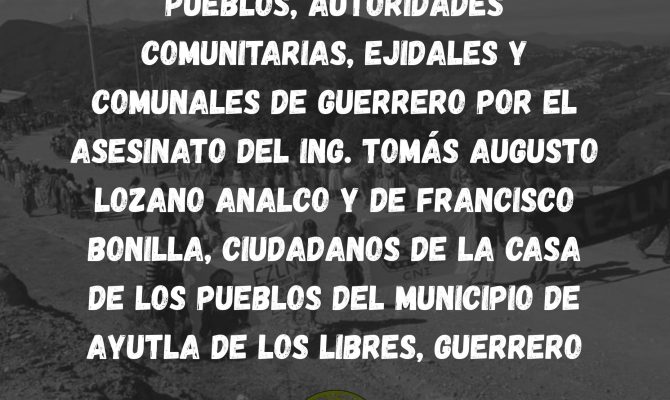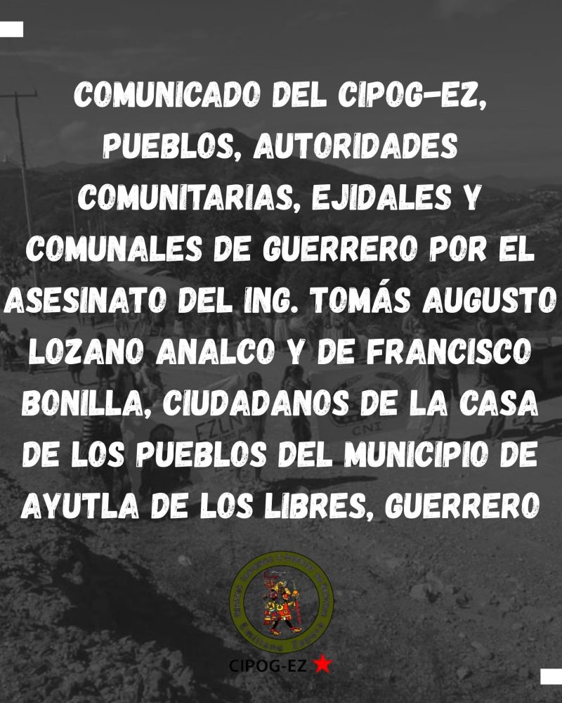 Comunicado del CIPOG-EZ, pueblos, autoridades comunitarias, ejidales y comunales de Guerrero por el asesinato del Ing. Tomás Augusto Lozano Analco y de Francisco Bonilla, ciudadanos de la Casa de los Pueblos del municipio de Ayutla de Los Libres, Guerrero.