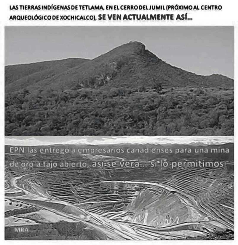 Espejo 20: La comunidad nahua de Xoxocotla, del Surponiente de Morelos, en zonas aledañas al sitio sagrado denominado Xochicalco es amenazada con la imposición de un proyecto minero que abarca 7 concesiones en 3 municipios que abarcan una superficie de 15 mil hectáreas en Xoxocotla, Temixco, Xochitepec y Miacatlán, en las comunidades Tetlama, Alpuyeca, Coatetelco, La Toma, Xochicalco.