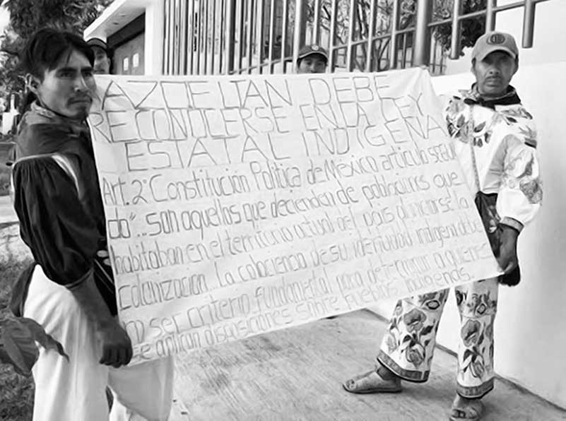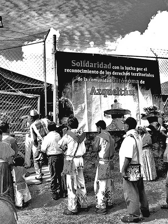 Espejo 4: En el municipio de Villa Guerrero, Jalisco, la comunidad Autónoma Wixarika- Tepehuana de San Lorenzo de Azqueltán que a pesar de tener un título virreinal desde el año de 1733, no ha sido reconocida en su territorio y por el contrario, se ha puesto a merced de caciques y gobiernos la superficie que siempre ha sido de ellos. El bosque es talado, invadido el territorio y destruidos sus sitios sagrados, como es el Cerro Colotlán, donde el mal gobierno ha dado su aval y dinero a los terratenientes para que usen cientos de piedras ceremoniales labradas como barreras de piedra para supuestas obras de protección de suelo. Lo que no solo es un despojo sino un genocidio.