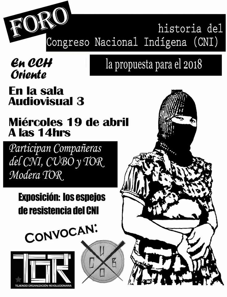 En el Foro participan compañeros del Congreso Nacional Indígena, TOR y CUBO. En el lugar se montará la exposición fotográfica: Espejos de Resistencia y Rebeldía.