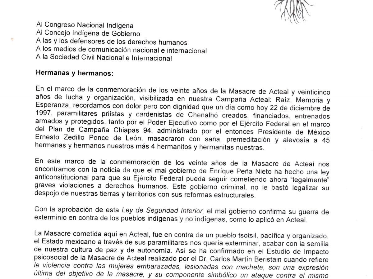 Comunicado de Las Abejas/Consejo Pacifista. A 20 años de la masacre de Acteal