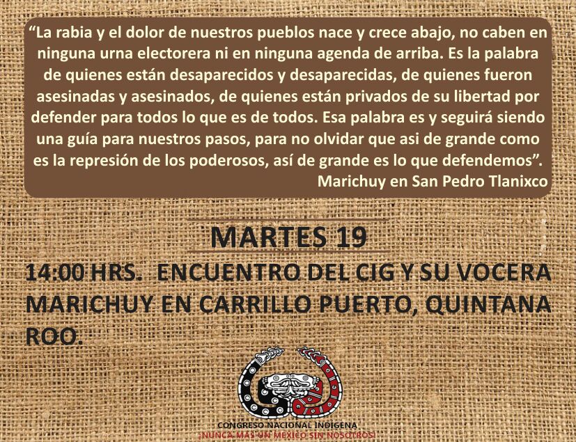 «La rabia y el dolor de nuestros pueblos nace y crece abajo, no caben en ninguna urna electorera ni en ninguna agenda de arriba. Es la palabra de quienes están desaparecidos y desaparecidas, de quienes fueron asesinadas y asesinados, de quienes están privados de su libertad por defender para todos lo que es de todos. Esa palabra es y seguirá siendo una guía para nuestros pasos, para no olvidar que asi de grande como es la represión de los poderosos, así de grande es lo que defendemos». Marichuy, Tlanixco