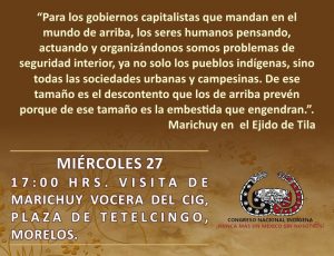 «Para los gobiernos capitalistas que mandan en el mundo de arriba, los seres humanos pensando, actuando y organizándonos somos problemas de seguridad interior, ya no solo los pueblos indígenas, sino todas las sociedades urbanas y campesinas. De ese tamaño es el descontento que los de arriba prevén porque de ese tamaño es la embestida que engendran». Marichuy, Tila