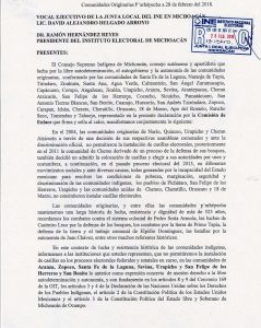 En este contexto de lucha y resistencia histórica de las comunidades indígenas, informamos a las instituciones que ustedes representan, que no permitiremos la instalación de casillas en los procesos electorales federales y estatales en curso, en las comunidades de Aranza, Zopoco, Santa Fe de la Laguna, Sevina, Urapicho y San Felipe de los Herreros y San Benito lo anterior como expresión concreta de nuestro derecho a la libre autodeterminación y autonomía, y con fundamento en los artículos 8 y 9 del Convenio 169 de la OIT, los artículos 3 y 4 de la Declaración de las Naciones Unidas sobre los Derechos de los Pueblos Indígenas, el artículo 2 de la Constitución Política de los Estados Unidos Mexicanos y el artículo 3 de la Constitución Política del Estado libre y Soberano de Michoacán de Ocampo.