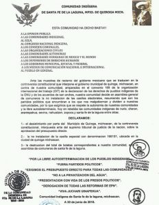 Ante las muestras de racismo del Gobierno mexicano que se traducen en la controversia constitucional que interpone el Gobierno municipal de Quiroga, Michoacán, en contra de nuestra comunidad, amparados en el convenio 169 de la organización inteenacional del trabajo (OIT) de la declaracion de los derechos de pueblos indigenas de la ONU y de los Acuerdos de San Andrés, nuestra comunidad decide en Asamblea general de comuneros la no instalación de casillas electorales, resumiendo que son los partidos políticos que encumbran a los que nos malgobiernan y dividen a nuestras comunidades, por lo que exigimos que se respete la autonomía de nuestras comunidades y la libre autodeterminación, hoy en rebeldía las comunidades indigenas de Nurio, Cheran, Arantepakua, Sevina, Nahuatzen, Zopoco, Santa Fe de la Página entre otras