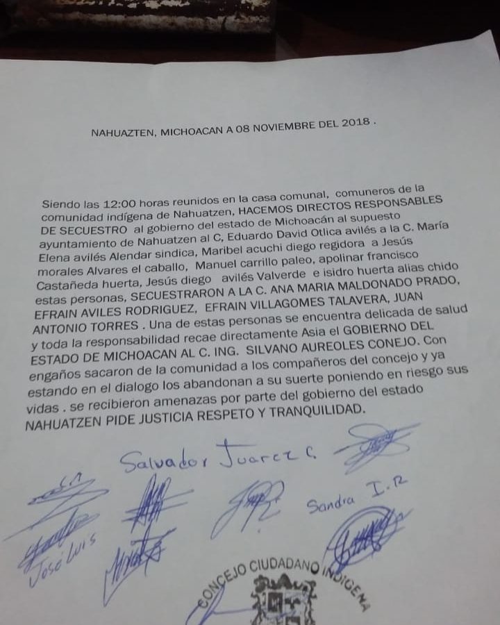 Denuncia del Concejo Ciudadano Indígena de Nahuatzen por el secuestro de sus compañeras por parte del gobierno de Michoacán