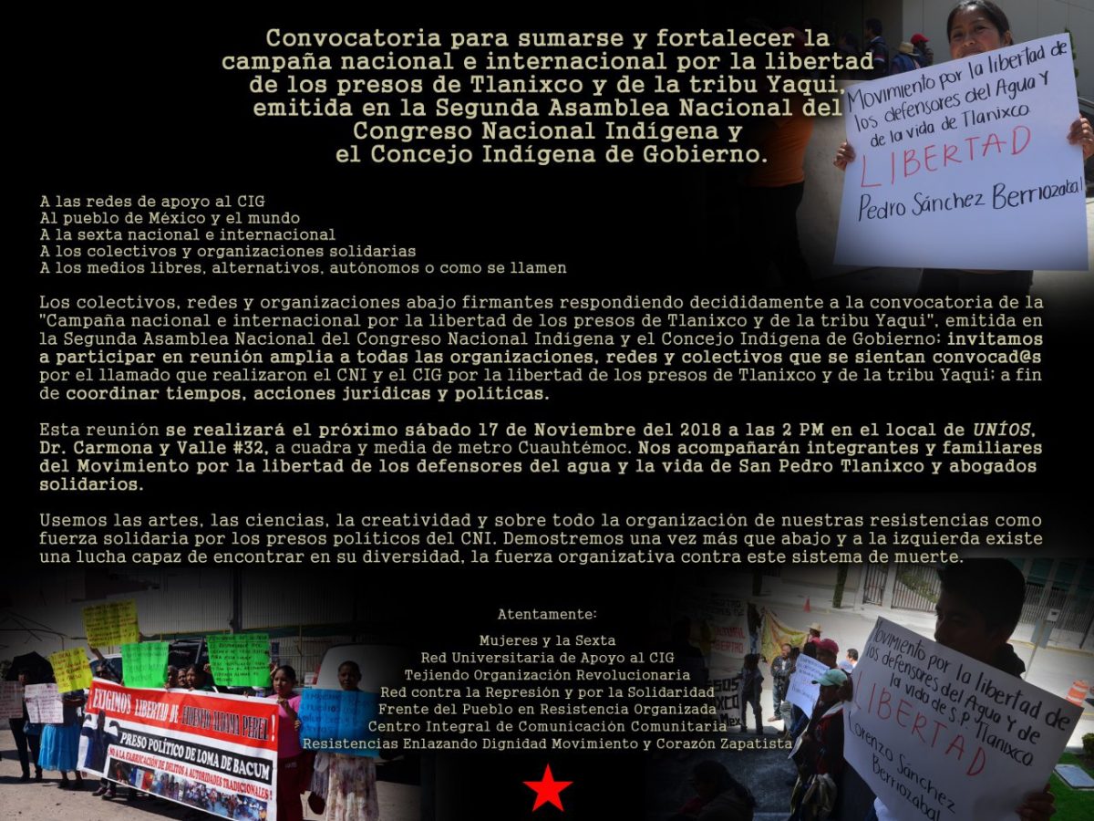 Convocatoria para Sumarse y Fortalecer la Campaña Nacional e Internacional por la Libertad de los Presos de Tlanixco y la Tribu Yaqui