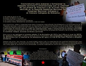 Los colectivos, redes y organizaciones abajo firmantes respondiendo decididamente a la convocatoria de la «Campaña Nacional e Internacional por la Libertad de los presos de Tlanixco y la Tribu Yaqui», emitida en la Segunda Asamblea Nacional del Congreso Nacional Indígena y del Concejo Indígena de Gobierno: invitamos a participar en la reunión amplia a todas las organizaciones, redes y colectivos que se sientan convocad@s por el llamado que realizaron el CNI y el CIG por la libertad de los presos de Tlanixco y la Tribu Yaqui: a fin de coordinar tiempos, acciones políticas y jurídicas.
