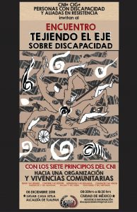 Por medio de la presente les hacemos la más cordial invitación para participar en este Encuentro al que convoca el Congreso Nacional Indígena (CNI) y el Concejo Indígena de Gobierno (CIG) para trabajar sobre el eje Discapacidad. Desde hace meses compañeras y compañeros con y sin discapacidad estamos trabajando en torno a pensar de manera colectiva la discapacidad dentro de un mundo donde quepan muchos mundos.