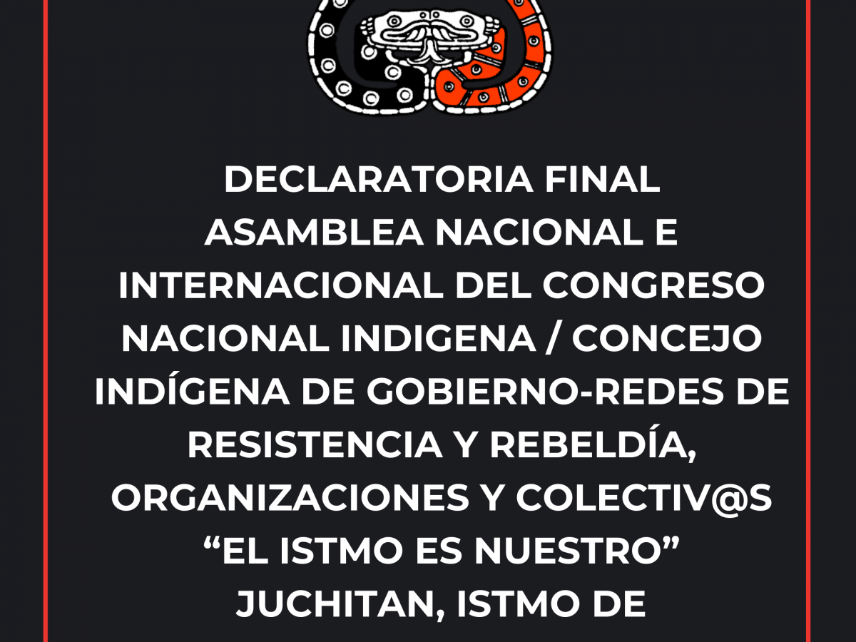 DECLARATORIA FINAL DE LA ASAMBLEA NACIONAL E INTERNACIONAL DEL CONGRESO NACIONAL INDIGENA / CONCEJO INDÍGENA DE GOBIERNO-REDES DE RESISTENCIA Y REBELDÍA, ORGANIZACIONES Y COLECTIV@S “EL ISTMO ES NUESTRO” JUCHITAN, ISTMO DE TEHUANTEPEC, OAXACA