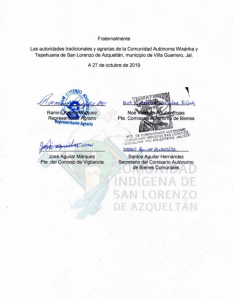 Las autoridades tradicionales y agrarias de la Comunidad Autónoma Wixárika y Tepehuana de San Lorenzo de Azqueltán, municipio de Villa Guerrero, Jalisco.