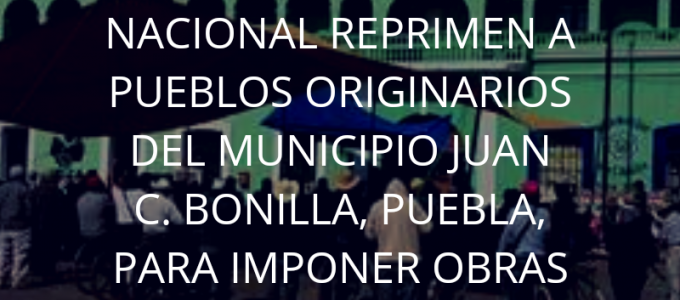 Al Congreso Nacional Indígena A la Comunidad Internacional A las Redes de Resistencia y Rebeldía A los Medios de Comunicación Libres Presente. Los pueblos originarios del Municipio de Juan C. Bonilla, integrados por San Mateo Cuanala, San Lucas Nextetelco, San Gabriel Ometoxtla y Santa María Zacatepec, así como la colonia José Ángeles. Manifestamos. … Sigue leyendo Policía Estatal, Policía Federal y Guardia Nacional reprimen a pueblos originarios del municipio Juan C. Bonilla, Puebla, para imponer obras vinculadas a Proyecto Integral Morelos