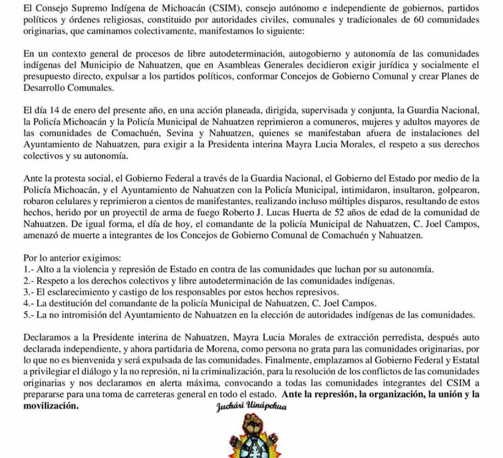 Comunicado: Consejo Supremo Indígena de Michoacán denuncia represión y amenazas de muerte en contra de Concejos Comunales de Comachuén, Sevina y Nahuatzen. Comunidades P`urhépecha a 15 de enero del 2020.