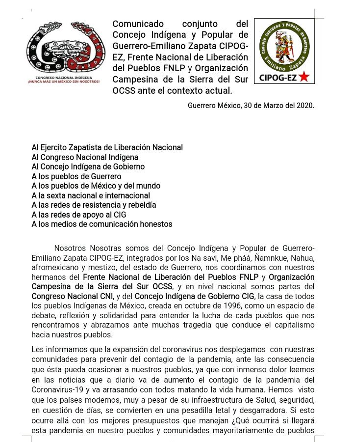 Comunicado conjunto del Concejo Indígena y Popular de Guerrero-Emiliano Zapata CIPOG-EZ, Frente Nacional de Liberación del Pueblos FNLP y Organización Campesina de la Sierra del Sur OCSS ante el contexto actual.