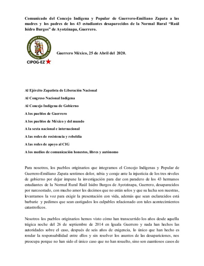 Guerrero México, 25 de Abril del 2020. Al Ejército Zapatista de Liberación Nacional Al…