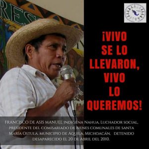 Indígena nahua, luchador social, presidente del comisariado de bienes comunales de Santa María Ostula, municipio de Aquila, Michoacán. Detenido y desaparecido el 20 de abril de 2010.