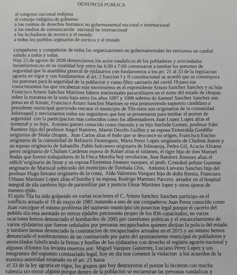 Ejido tila chiapas Mexico a 25 de agosto de 2020 DENUNCIA PUBLICA Al congreso nacional…