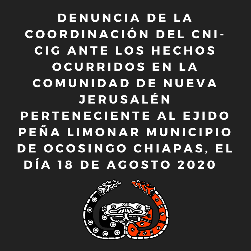 Denuncia de la Coordinación del CNI-CIG ante los hechos ocurridos en la comunidad de nueva Jerusalén perteneciente al ejido Peña Limonar municipio de Ocosingo Chiapas, el día 18 de agosto 2020