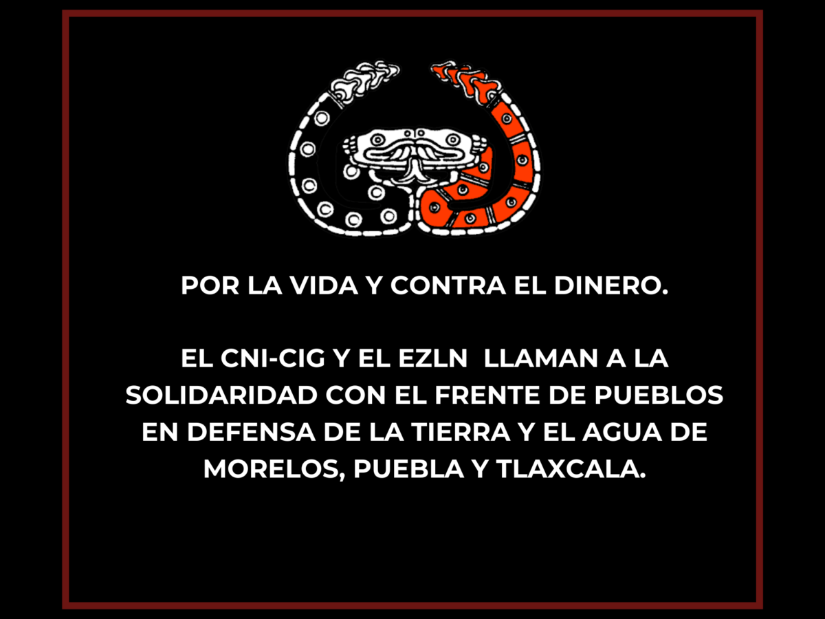 POR LA VIDA Y CONTRA EL DINERO. EL CNI-CIG y el EZLN LLAMAN A LA SOLIDARIDAD CON EL FRENTE DE PUEBLOS EN DEFENSA DE LA TIERRA Y EL AGUA DE MORELOS, PUEBLA Y TLAXCALA.
